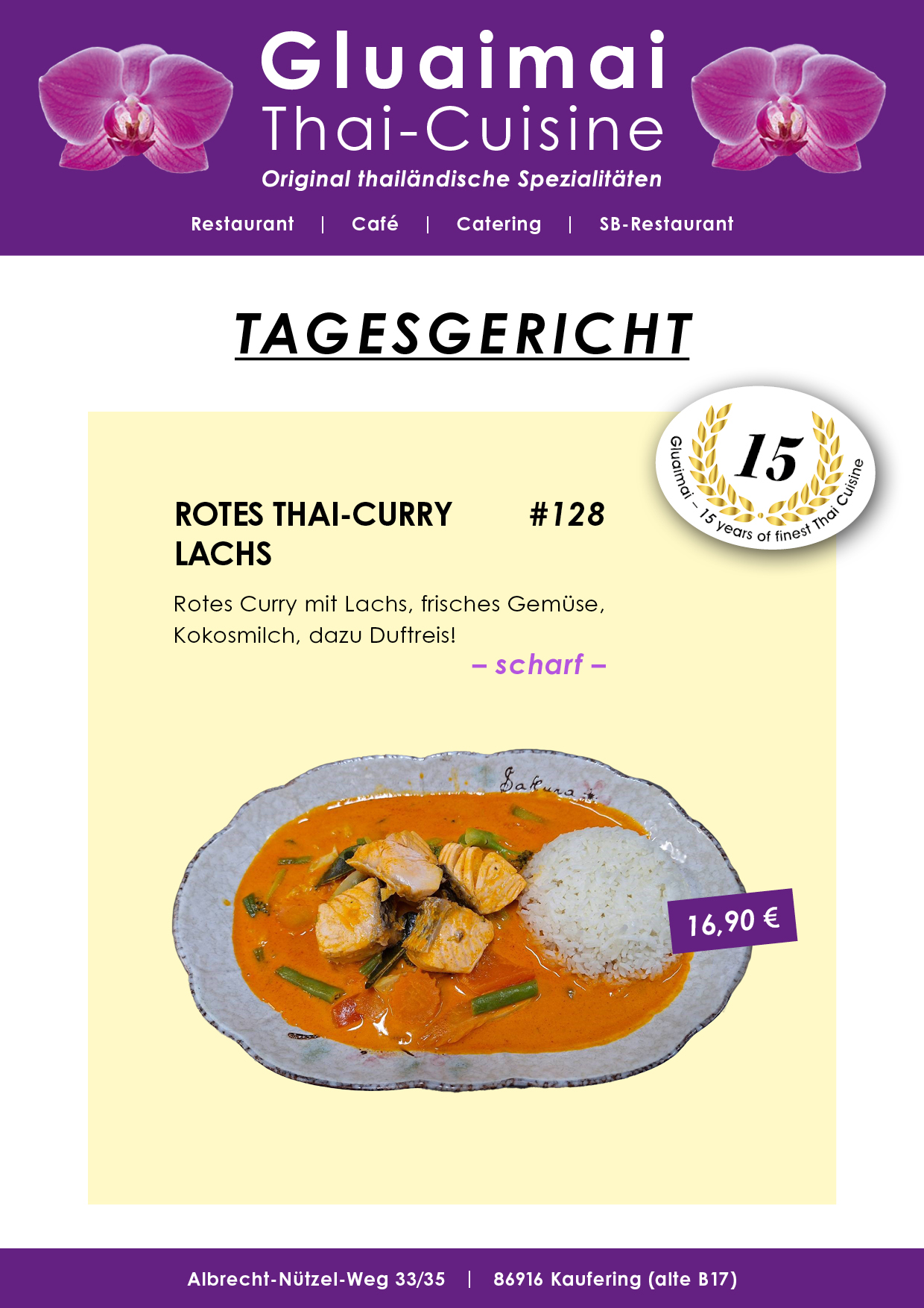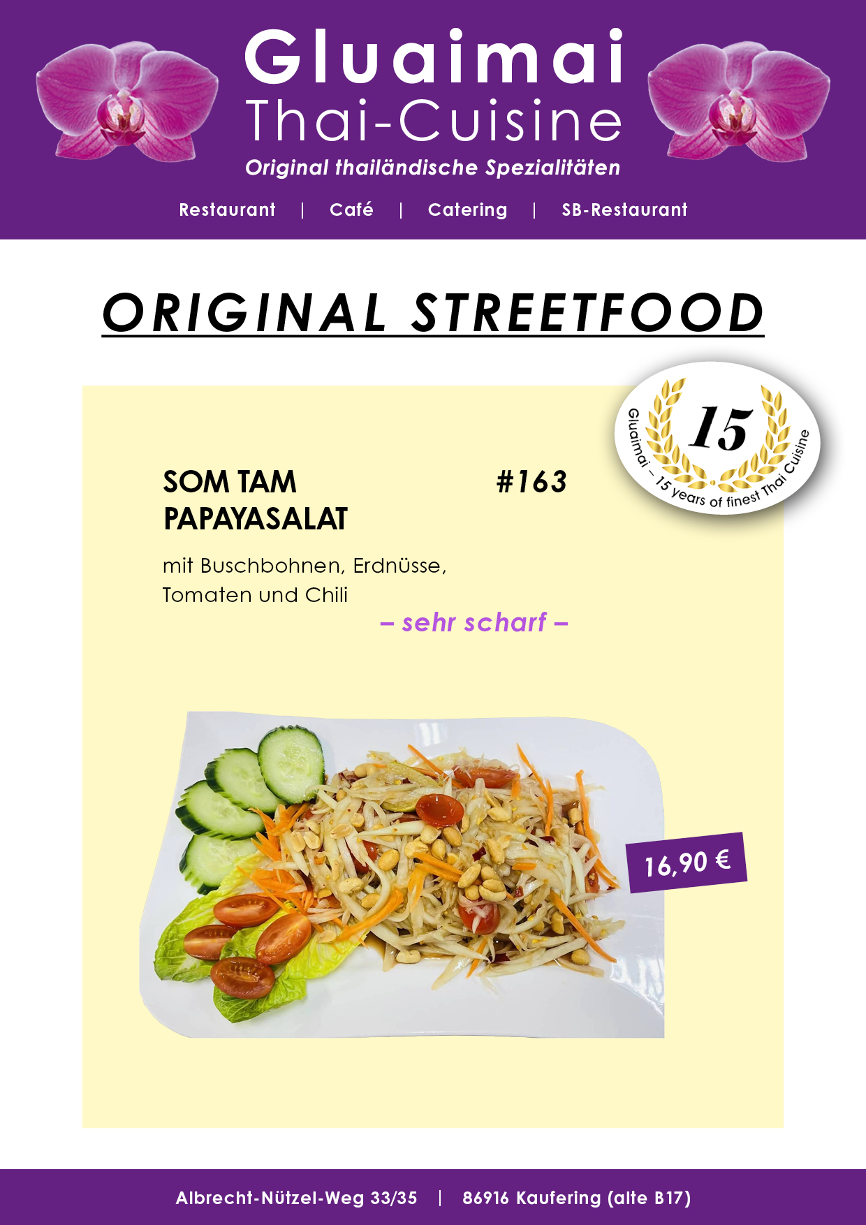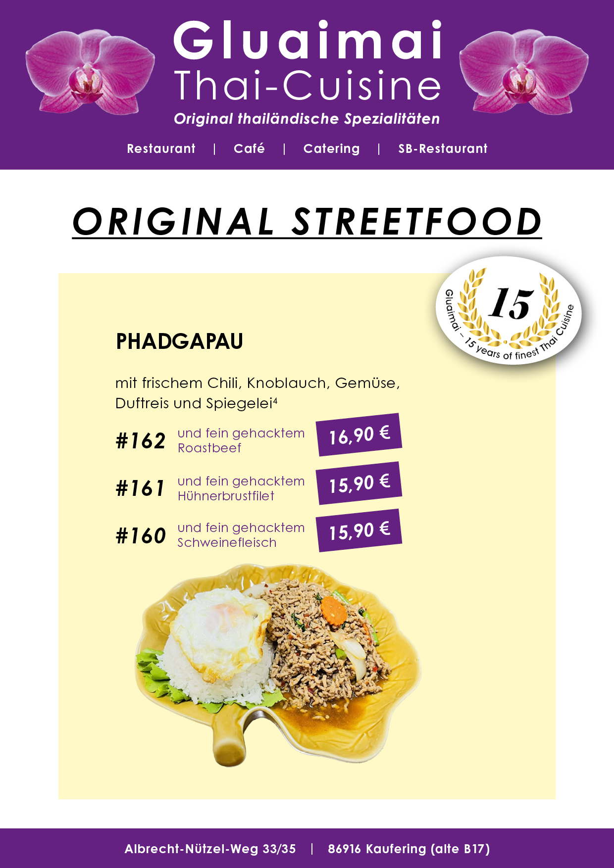 Wir bieten Suppen, Vorspeisen und Fingerfood, Thai-Salate, Nudel- und Reisgerichte, Schweine-, Rind-, Hühner- und Enten-, Garnelen- und Fischgerichte, sowie vegetarische und vegane Gerichte an.